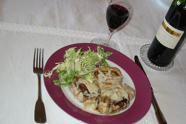 Faire revenir les tranches dans une poêle huilée jusqu’à ce qu’elles soient bien dorées. Puis ajouter le bouillon peu à peu et laisser cuire pendant 30 min (si nécessaire, rajouter du bouillon). A la fin on peut rajouter de la crème fraîche accompagnée de lardons ou de croûtons. Servir avec une salade verte.
