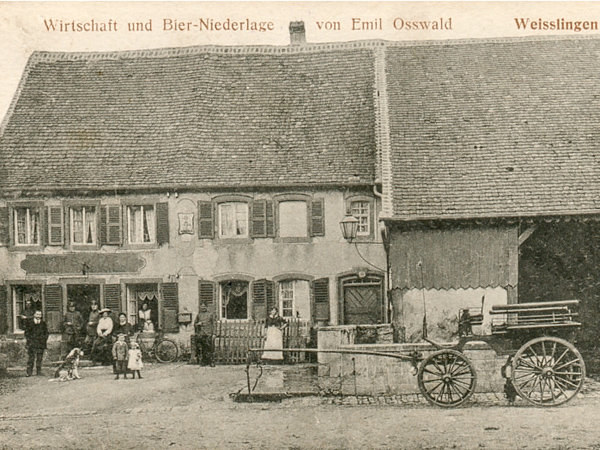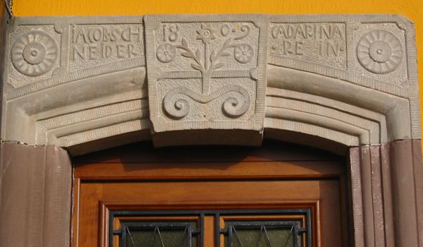 Extrait du descriptif : « La maison a été édifiée pour Jacob Schneider et son épouse Catherine en 1809, d’après l’inscription portée sur le linteau de la porte d’entrée. Jacob est né en 1784, Catherine en 1783 (issue de la famille Rein, établie à Petersbach). L’acte de leur mariage célébré le 25 novembre 1806 à l’église catholique de Weislingen précise que Jacob exerce la profession de maître-maçon-Maurermeister (AD Bas-Rhin, 4 E 522/4), expliquant la représentation sculptée d’une panoplie d’outils de tailleur de pierre sur une dalle ornant la façade principale de la maison. Sur le registre de recensement de population de 1836, Jacob est désigné comme cultivateur et habite avec son épouse et ses trois filles la maison qui est adressée au n°154, Dorfstrasse (AD Bas-Rhin, 7 M 782). Il décède à Weislingen le 14 janvier 1852 (AD Bas-Rhin, 4 E 522/9). » >>> lire le descriptif complet
